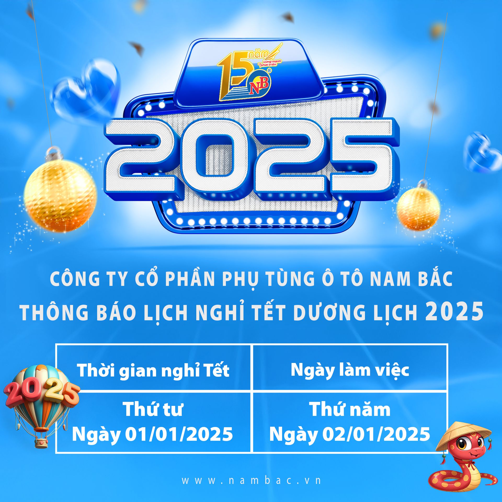 NAM BẮC xin được thông báo đến quý khách hàng lịch nghỉ Tết Dương Lịch 2025 của công ty chúng tôi như sau: